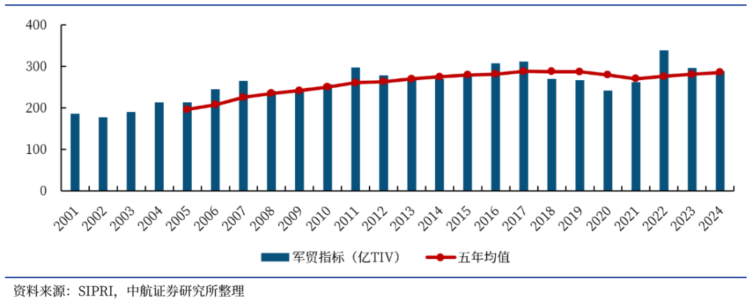 2024年,SIPRI全球军贸指标略有下降,但是军贸热度仍然维持在高位,根据SIPRI数据,单年度看,全球军贸指标在2022年高速增长,创下21世纪以来新高,但由于军贸订单签订与交付存在时间差,以及近年来二手装备占比提升的影响,2023年全球军贸指标同比下降12.37%,2024年再次同比下降2.51%,而2020-2024年军贸指标的五年均值则依旧实现了同比1.56%的增长。基本符合历史上军贸指标存在周期性波动,但整体重心上行趋势不变的特点。