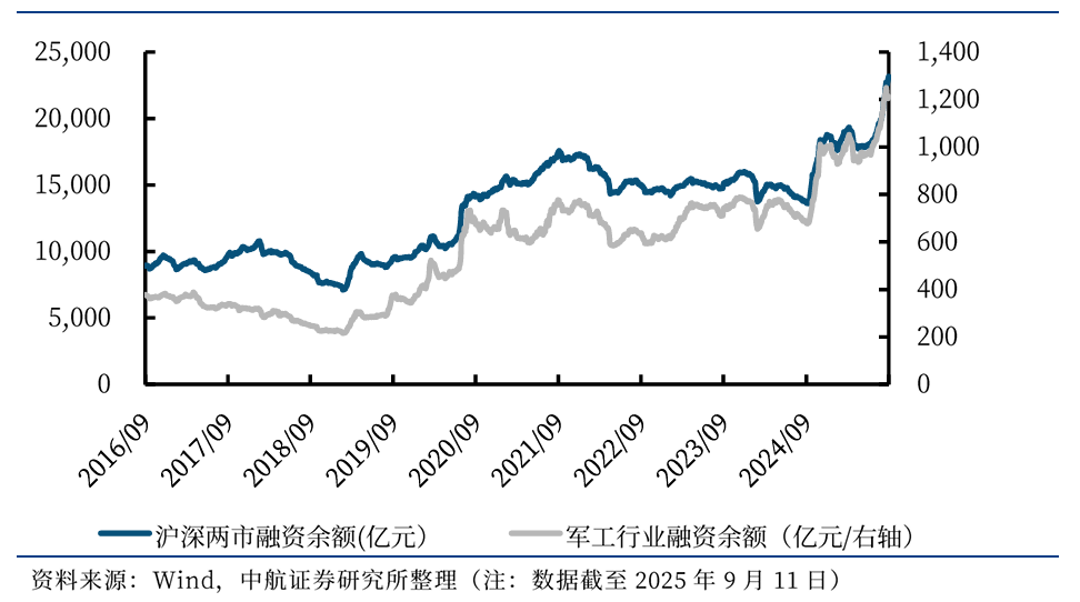 截至2025年9月11日,军工行业的融资余额合计1211.70亿元,比上周环比上升0.39%,占两市融资余额比例为5.23%。