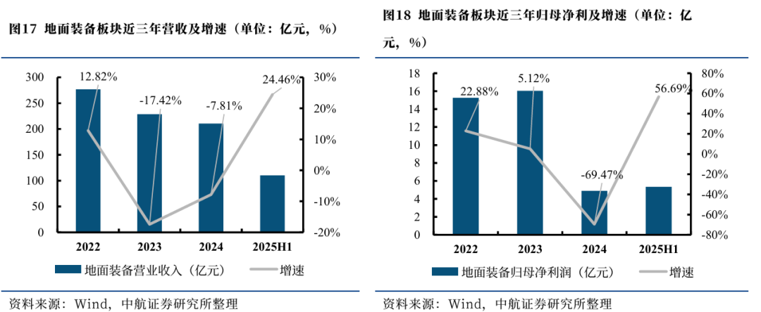 2025年上半年军工上市公司地面装备板块合计实现营业收入(110.33亿元,+24.46%),归母净利润(5.34亿元,+56.69%)。