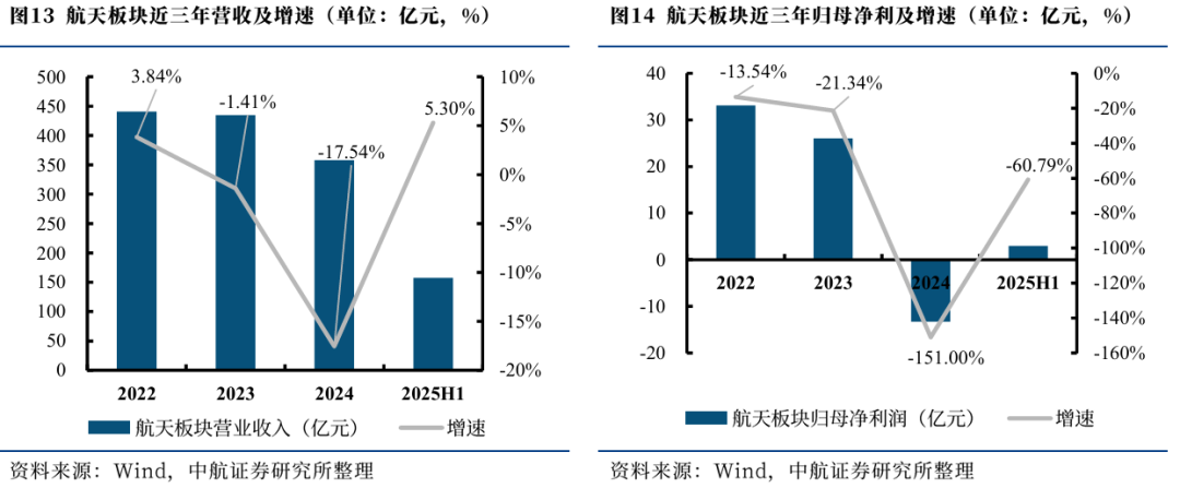 2025年上半年,航空航天相关业务来看,尽管从营收占比较大的主机厂来看,收入利润仍承受了一定的压力,显示出交付结构和下游订单确认的节奏仍处于调整之中,但从上游来看,部分环节业绩已得到一定程度的修复;同时,此前我们强调的大军工逻辑逐渐落地,商业航天、军事智能化等需求为中上游板块带来了一定的新增量,推动了其业绩的触底反弹和修复。