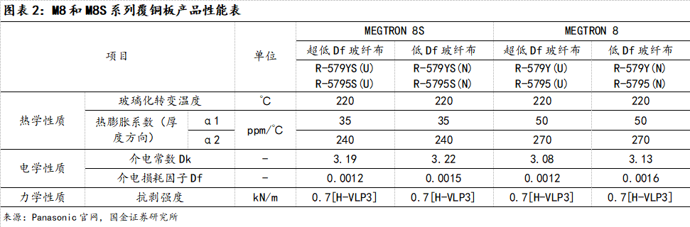 在我们之前发布的一篇深度报告《AI系列深度(三):超级芯片推动AI赋能预想,刺激高频高速树脂材料需求》中提到,M8及M8S系列覆铜板的介电损耗因子Df仅有0.0012-0.0016之间,从M9的部分性能数据可以推断,M9系列覆铜板的Df值较M8系列更低,这就意味着原本使用较多的PPO/PPE高频高速树脂更难以满足M9覆铜板的性能需求,介电性能的突破带动了上游树脂材料的进一步升级。参考M8介电损耗因子性能参数,主体PPO树脂参杂PCH/ODV树脂可以满足电性能的需求,但是M9覆铜板或将更多地使用碳氢树脂及特种碳氢树脂才能满足电性能的需求。展望未来覆铜板树脂材料的升级换代,M10级别的覆铜板或将使用介电性能更高、技术难度更大的电子级PTFE树脂,或是碳氢树脂、PTFE等高性能树脂的综合使用方案。