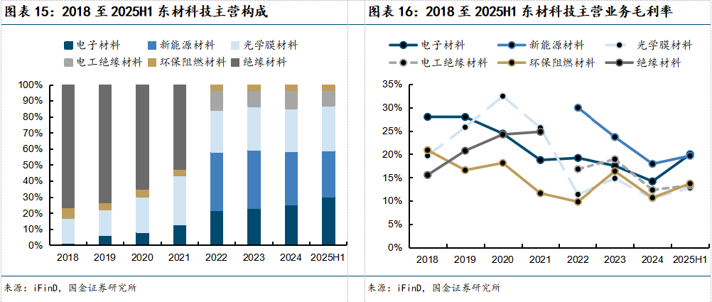 公司目前的主营业务包括新能源材料、光学膜材料、电子材料、环保阻燃材料等,其中新能源材料主要生产晶硅太阳能电池背板基膜、特种环氧树脂等,光学膜材料为光学级聚酯基膜,电子材料为电子级树脂,环保阻燃材料为环保阻燃共聚型聚酯树脂。各个业务的毛利率水平均维持在较高水平。