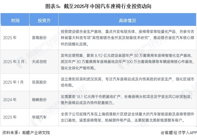 近年来,多家汽车座椅企业有着积极的投资动向。2023年,华域汽车全资子公司延锋汽车在上海临港新片区,建设主要配套北美新能源整车客户的座椅零部件出口基地。2024年,继峰股份定增募资用于合肥基地扩产等项目,提升座椅总成及内饰件配套能力。2025年,富维股份投资建设镁合金生产基地并参与相关技术研究;天成自控发布定增预案,强化全球化产能布局;双英股份设立贵阳双英和武汉双英,强化区域市场布局。