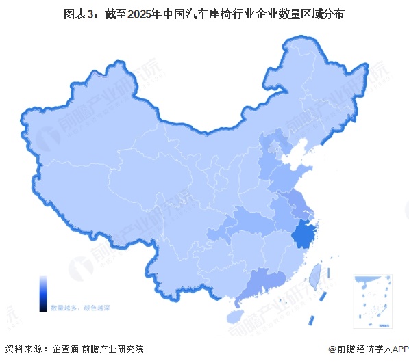 汽车座椅行业产业链区域热力地图:浙江省为主要聚集地根据中国企业数据库企查猫,目前中国汽车座椅注册企业主要集中在浙江省,此外广东省、江苏省等也具有不少布局汽车座椅业务相关的企业。