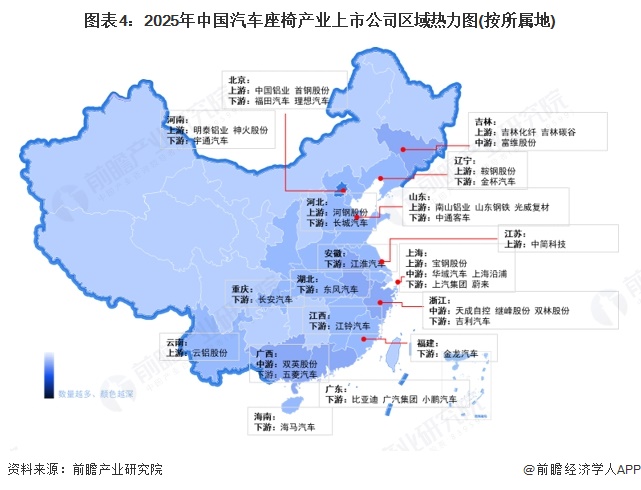 汽车座椅产业链的上市企业遍布全国多个省份,其中主要集中在华东沿海省份。其中上海市的汽车座椅上市企业有华域汽车、上海沿浦,浙江省的汽车座椅上市企业有天成自控、继峰股份、双林股份等。