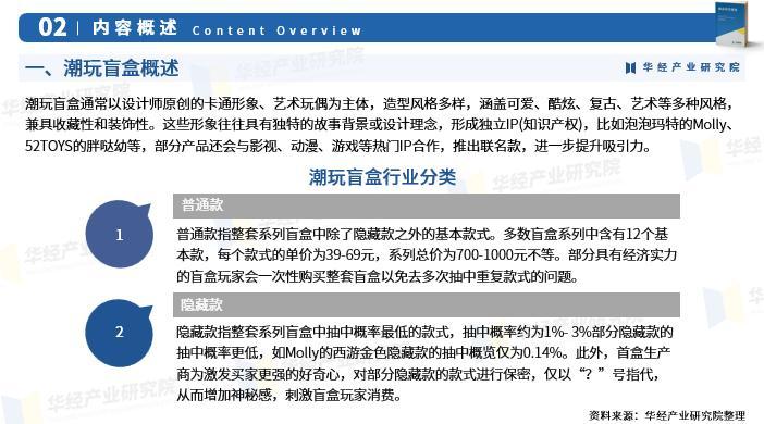 华经产业研究院为助力企业、科研、投资机构等单位了解潮玩盲盒行业发展态势及未来趋势,特重磅推出《2025-2031年中国潮玩盲盒行业市场竞争格局及投资前景展望报告》,本报告由华经产业研究院研究团队对潮玩盲盒行业进行多年跟踪研究,使用桌面研究与定量调查、定性分析相结合的方式,全面解读潮玩盲盒行业市场,深度挖掘行业潜在商机;科学运用研究模型,多维度对行业投资风险进行评估后精心研究编制。