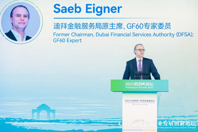 图:国家绿色发展基金党委书记、董事长寿伟光迪拜金融服务局原主席、GF60专家委员Saeb Eigner以“跨国协作:构建韧性与低碳的贸易通道”为题发表主旨演讲。他指出,可持续贸易与气候治理亟需全球协作,不仅能降低成本,还能激发创新。治理框架应紧密衔接贸易流动、气候目标与投资标准。未来,全球合作及治理需要多方建立联系并加强互信,因为信任、透明与标准是全球绿色贸易互利的前提,也与中国的互利共赢理念相吻合。
