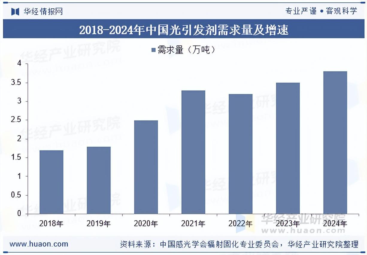 我国光引发剂自2022年出现阶段性下滑,主要系行业下游需求走弱下光引发剂价格有所下行。2022年后我国光引发剂需求逐年增长,据统计,2024年我国光引发剂需求量为3.8万吨,同比增长8.6%。