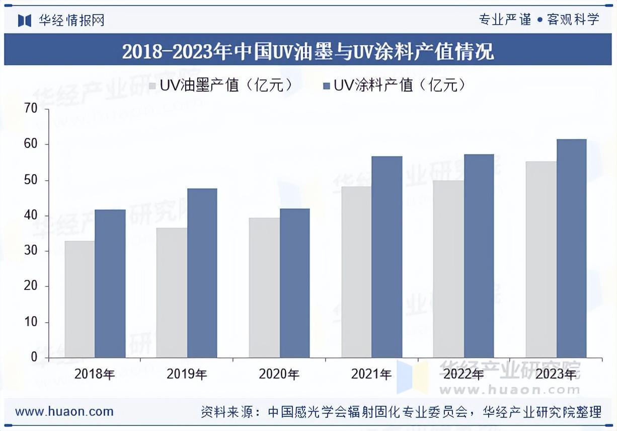 光引发剂属于辐射固化行业,而中间体产品则广泛应用于医药、农药、染料等多个行业。光固化技术是一种高效、节能、环保、优质、适应性强的材料表面处理和加工技术,可以将光固化产品以传统涂料数千倍的速度迅速固化、上色,形成一层高强度的保护膜。近年来我国UV油墨与UV涂料产值逐年增长,2023年产值分别为55.37亿元与61.76亿元,分别同比增长10.61%与8.13%。