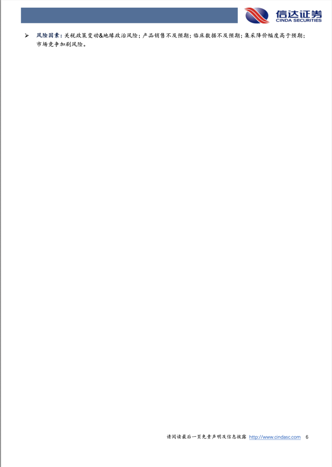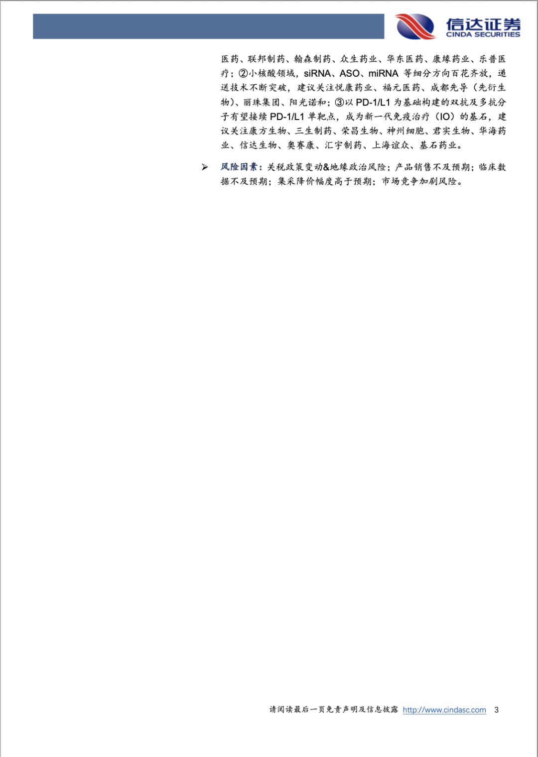风险因素:关税政策变动&地缘政治风险;产品销售不及预期;临床数据不及预期;集采降价幅度高于预期;市场竞争加剧风险。