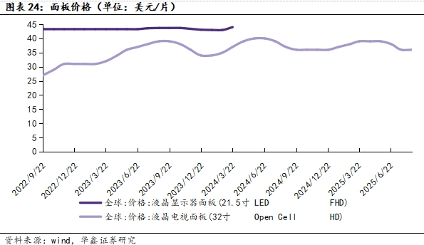 面板价格保持稳定态势。面板价格自2021年7月以来,价格持续下降,目前价格整体保持稳定,其中液晶电视面板:32寸:OpenCell:HD价格近期略有回升,2025年8月22日为36美元/片,液晶显示器面板:21.5寸:LED:FHD价格自2022年8月23日以来,价格逐步由44.3美元/片下降至43美元/片,2024年3月22日价格略有上升,为44美元/片。
