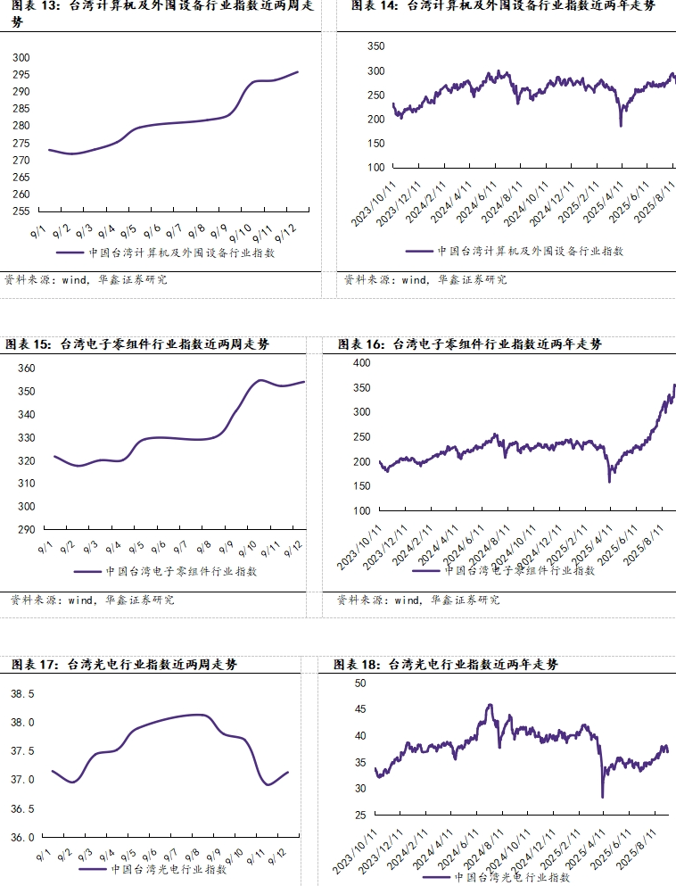 行业指标上,我们依次选取台湾半导体行业指数、台湾计算机及外围设备行业指数、台湾电子零组件行业指数、台湾光电行业指数,来观察行业整体景气。日期上,我们分别截取各指数近两周的日度数据、近两年的周度数据,来考察不同时间维度的变化。
