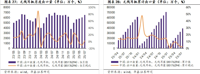 无线耳机方面,国内海关出口数据显示,2023 年以来呈现复苏趋势,2024年全年无线耳机月度出口量同比增幅大部分时间为正,累计出口量同比稳定增长。2025年上半年无线耳机的累计同比始终为正,累计出口量稳定增长。无线耳机技术已经充分成熟,相对于手机消费,无线耳机普及还有空间,随着无线耳机传感器的增多,产品体验感会更加出色,叠加价值量相对手机较小,换机周期会显著快于手机。因此,随着国内的放开和经济复苏,我们继续看好无线耳机这类可穿戴设备的成长。