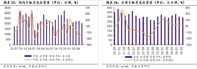 2025年6月国内手机出货量同比下13.8%。全球范围内,2024年全球智能手机出货量同比增长6.56%,分季度来看,四个季度手机出货量均维持上升。2024年全球手机出货量逐渐回暖,主要由于两个方面,一方面是全球进入新一轮换机周期;另一方面是折叠机、AI手机等新产品不断发布。2025年前两个季度全球手机出货量则开始出现下降趋势,Q2出货量下降至2.95亿部。