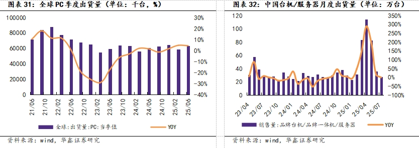 个人电脑方面,2025年第一季度,全球PC出货量同比上升4.75%;第二季度全球PC出货量同比上升4.43%。2025年7月,国内品牌台机出货量达到27.78万台,同比增长0.24%。回顾历史,2020-2021年疫情带来居家办公需求快速上升,推动PC重回增长轨道,但疫情带来的短期复苏结束后PC重回弱势趋势,在2022Q2开始进入下行区间,2023Q3开始出货量同比降幅逐步收窄,全年品牌台机/品牌一体机/服务器出货量同比微增2.62%。AI大模型落地给PC产业链带来新的创新驱动力,另外PC换机潮的到来,2025年PC市场有望恢复增长。