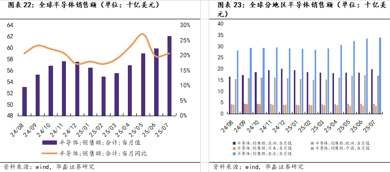 全球半导体销售额自2024年4月份触底以来逐步攀升,6月出现下降趋势。2025年7月,全球半导体当月销售额为620.7亿美元,同比增长20.6%,环比增长3.61%,其中中国销售额为 170.2亿美元,环比下降1.28%,占比达27.42%。自2024年2月以来,全球半导体销售额同比连续保持正增长,半导体行业景气度提升显著,2025年6月增速开始放缓。
