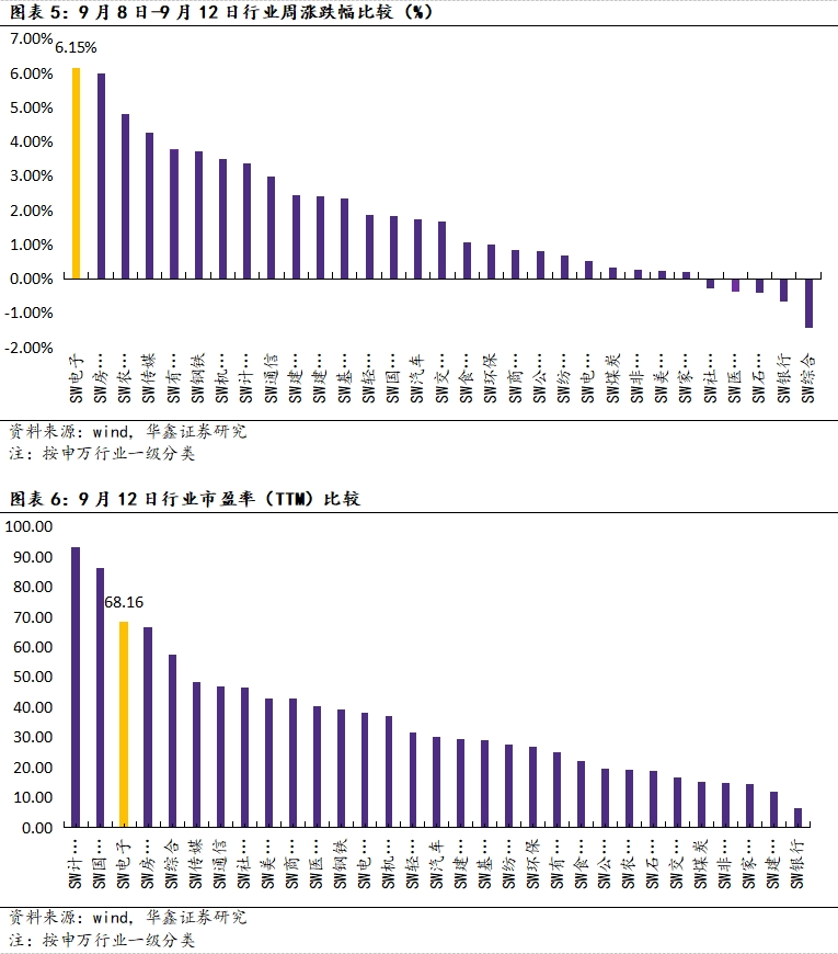 跨行业比较,9月8日- 9月12日当周,申万一级行业涨跌呈分化的态势。其中电子行业上涨6.15%,位列第1位。估值前三的行业为计算机、国防军工、电子,电子行业市盈率为68.16。