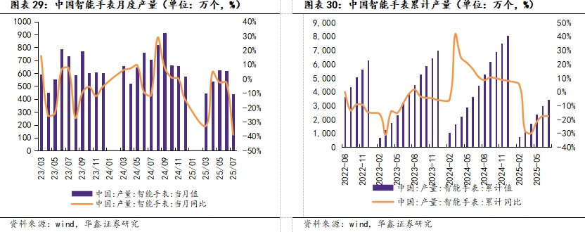 中国智能手表进入 2024 年之后出现反弹,第一季度智能手表累计产量同比增长33.01%,打破近两年的持续下滑趋势,第二季度智能手表累计产量同比增长1.94%,第三季度智能手表累计产量同比增长21.26%,第四季度智能手表累计产量同比增长9.38%,增幅有所缩窄。2025年,第一季度智能手表累计产量同比下降28.95%,第二季度智能手表累计产量同比下降9.94%。我们认为随着生成式 AI 与终端硬件的结合,智能手表未来有望集成更多 AI 功能,从而为市场增长开辟新途径。