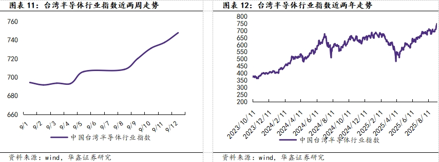 近两周:环比看,9月1日-9月12日两周,台湾半导体行业指数以及台湾计算机外围设备行业指数均呈现显著的上升趋势;台湾电子零组件行业指数亦呈现震荡上行的趋势;台湾光电行业指数则呈现先上行后下降的趋势。