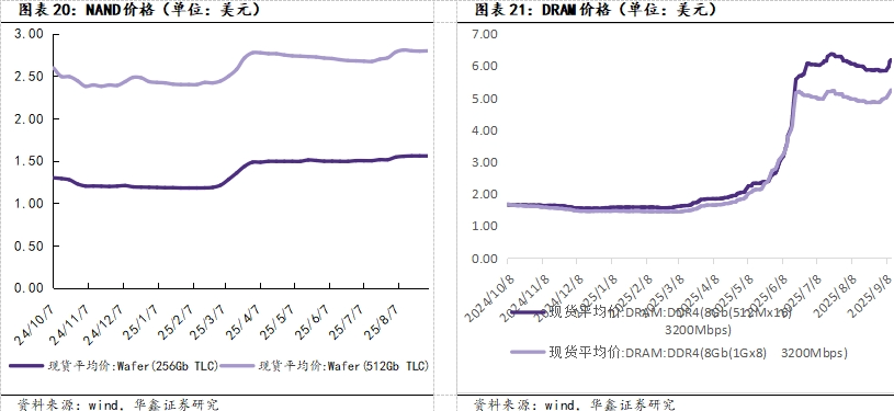 尽管上游头部供应商陆续宣布减产,但由于消费电子市场需求疲软,存储芯片价格整体呈现波动下降趋势。NAND方面:Wafer:512GbTLC现货平均价从2023年7月底开始回升,随后从2024年3月底进入小幅回升,2025年9月1日价格为2.80美元。DRAM方面:DRAM:DDR4(8Gb(512Mx16),3200Mbps)现货平均价从2024年3月以来价格略有下滑,6月之后呈现小幅回升态势,9月之后又重回下跌态势,12月以来略有回升后变化趋于平缓,2025年3月以来呈现大幅上涨的态势,2025年8月以来出现小幅下跌的趋势。2025年9月12日价格为6.19美元。