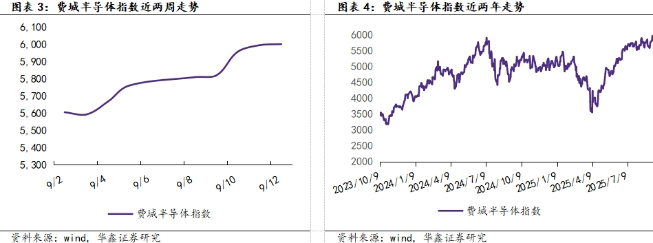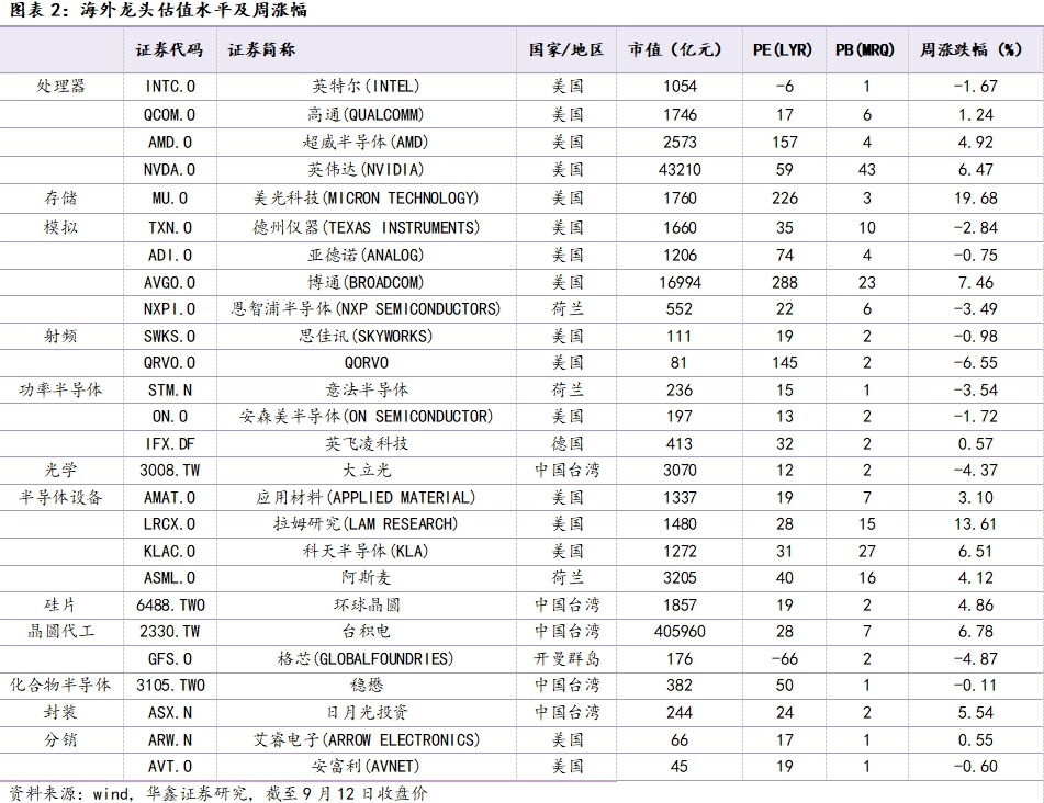 从数据来看,9月8日-9月12日当周,费城半导体指数呈现上升的态势,近两周整体处于震荡上行的态势。更长时间维度上来看,2023 年8月处于震荡下行行情,10月底开始持续上涨。2024年上半年整体处于上升态势,7月出现大幅回调,8月处于震荡下行行情,9月出现探底回升,四季度总体处于震荡的态势。2025年一季度呈现先涨后跌的走势,4月后逐渐回升,二季度三季度均呈现震荡上行的态势。