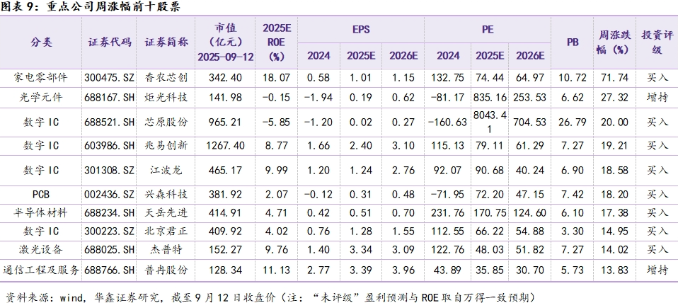 9月8日-9月12日当周,重点关注公司周涨幅前十:数字IC独占四席,家电零部件、光学元件、PCB、半导体材料、激光设备、通信工程及服务各占一席。香农芯创(家电零部件)、炬光科技(光学元件)、芯原股份(数字IC)包揽前三,周涨幅分别为71.74%、27.32%、20.00%。