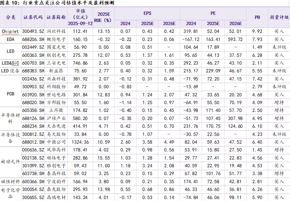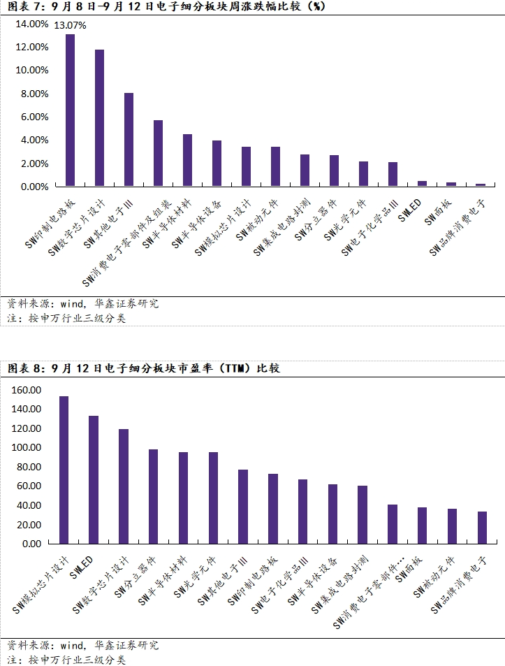 电子行业细分板块比较,9月8日-9月12日当周,电子行业细分板块均呈上涨态势。其中,印制电路板涨幅最大,达到13.07%。估值方面,模拟芯片设计、LED、数字芯片设计板块估值水平位列前三,分立器件和半导体材料板块估值排名本周第四、五位。