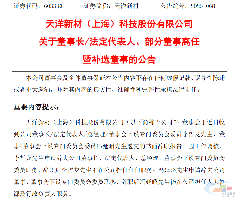 9月12日晚,天洋新材发布公告称,公司董事长/法定代表人/总经理/董事会下设专门委员会委员李哲龙、董事/董事会下设专门委员会委员冯延昭递交的书面辞职报告。