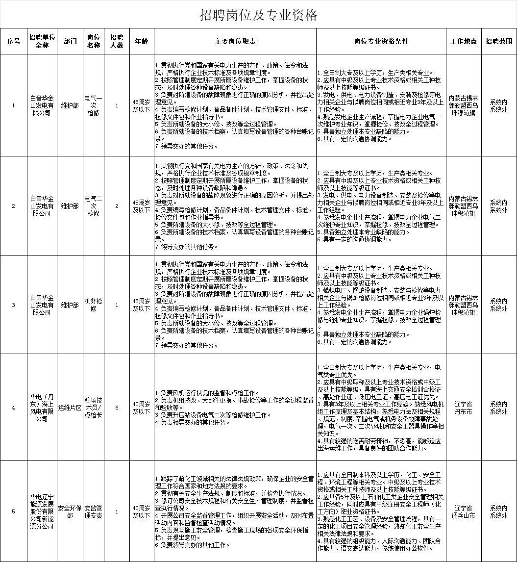 华电辽宁能源发展股份有限公司(以下简称“华电辽宁公司”)成立于2009年8月,为满足生产运营需要,华电辽宁公司所属基层企业白音华金山发电有限公司、华电(丹东)海上风电有限公司、华电辽宁能源发展股份有限公司新能源分公司面向华电系统内外开展公开招聘工作,现将有关招聘事项公告如下:
