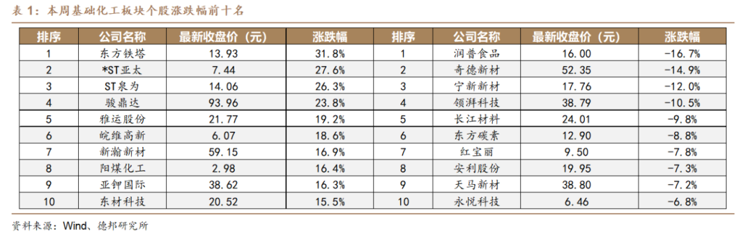 在基础化工板块424只股票中,本周252只股票上涨,167只股票下跌,5只股票持平。本周个股涨幅前十名分别为:东方铁塔(+31.8%)、*ST亚太(+27.6%)、ST泉为(+26.3%)、骏鼎达(+23.8%)、雅运股份(+19.2%)、皖维高新(+18.6%)、新瀚新材(+16.9%)、阳煤化工(+16.4%)、亚钾国际(+16.3%)、东材科技(+15.5%)。本周个股跌幅前十名分别为:润普食品(-16.7%)、奇德新材(-14.9%)、宁新新材(-12%)、领湃科技(-10.5%)、长江材料(-9.8%)、东方碳素(-8.8%)、红宝丽(-7.8%)、安利股份(-7.3%)、天马新材(-7.2%)、永悦科技(-6.8%)。