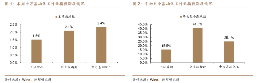 本周基础化工板块表现好于大盘。根据Wind,本周(9/6-9/12)上证综指涨跌幅为+1.5%,创业板指数涨跌幅为+2.1%;申万基础化工行业指数涨跌幅为+2.4%,在全部31个行业板块中位列第12位,跑赢上证综指0.8个百分点,跑赢创业板指数0.3个百分点。年初至今,上证综指涨跌幅为+15.5%,创业板指数涨跌幅为+41%;申万基础化工行业指数涨跌幅为+25.1%,跑赢上证综指9.6个百分点,跑输创业板指数15.9个百分点。