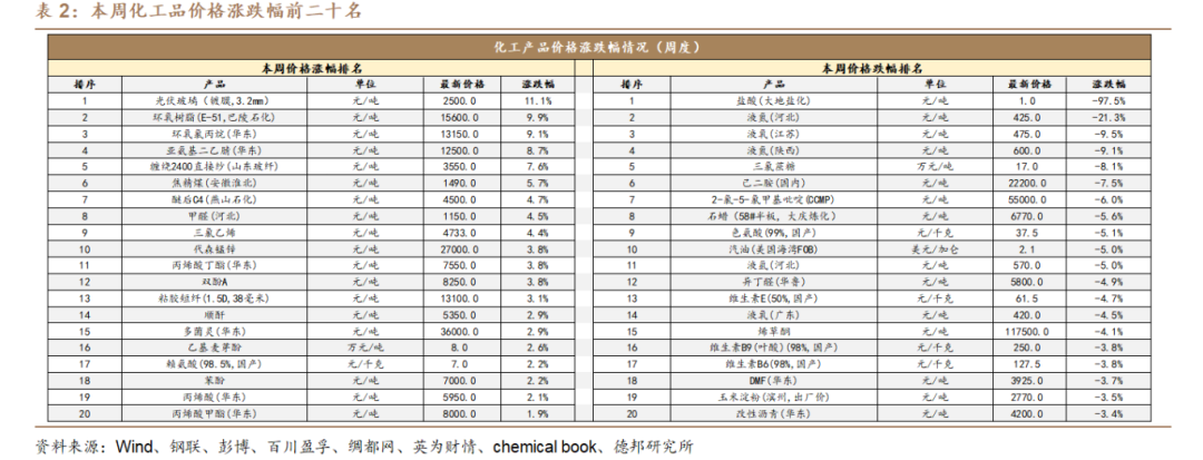 本周化工品价格涨幅前十名为:本周化工品价格涨幅前十名为:光伏玻璃(镀膜,3.2mm)(+11.1%)、环氧树脂(E-51,巴陵石化)(+9.9%)、环氧氯丙烷(华东)(+9.1%)、亚氨基二乙腈(华东)(+8.7%)、缠绕2400直接纱(山东玻纤)(+7.6%)、焦精煤(安徽淮北)(+5.7%)、醚后C4(燕山石化)(+4.7%)、甲醛(河北)(+4.5%)、三氯乙烯(+4.4%)、代森锰锌(+3.8%)。
