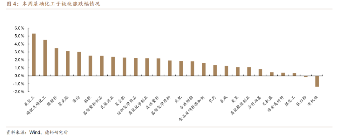 细分板块看,在基础化工26个子板块中,24个子板块上涨,2个子板块下跌。本周子版块涨跌幅前五名分别为:氟化工(+5.3%)、磷肥及磷化工(+4.5%)、膜材料(+3.5%)、聚氨酯(+3.1%)、涤纶(+3%);本周子版块涨跌幅后五名分别为:有机硅(-1.4%)、钛白粉(-0.2%)、煤化工(+0.3%)、非金属材料(+0.4%)、无机盐(+0.5%)。