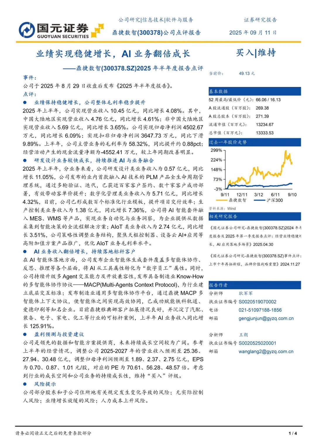 本报告摘自国元证券2025年9月11日已发布的《业绩实现稳健增长,AI业务翻倍成长——鼎捷数智(300378.SZ)2025年半年度报告点评》,具体报告及分析内容请详见报告。若因对报告的摘编等产生歧义,应以报告发布当日的完整内容为准。