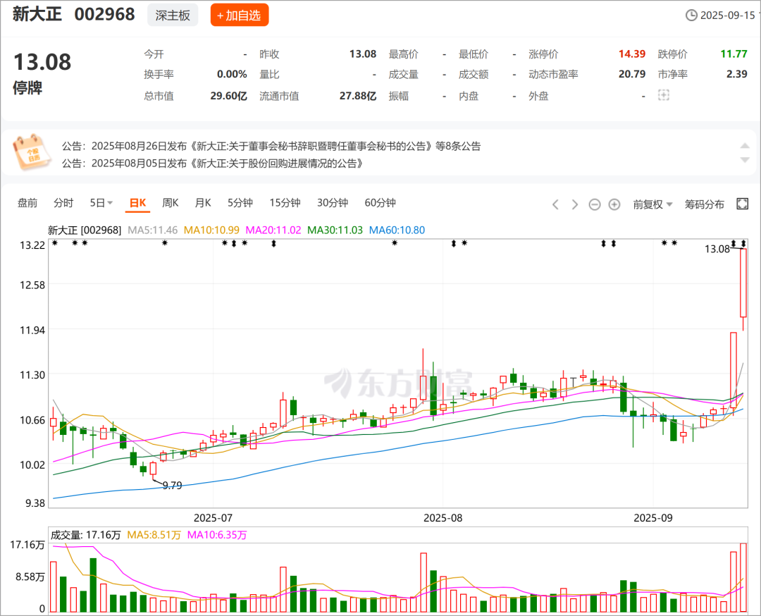 在新大正发布停牌公告前,该股在二级市场已经出现了明显异动。9月11日,新大正股价在早盘9点50分左右涨停,收盘价为11.89元。