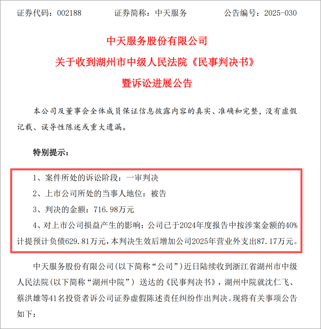 2025年8月,中天服务因2017年虚增营业收入4393万元的信息披露违规,被法院判决向41名投资者赔偿716.98万元。
