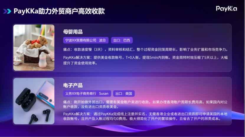 在企业出海的大背景下,PayKKa以B2B外贸收款、B2C电商收款和全球收单三大业务布局,并通过“牌照+技术+场景”的三维布局,以实用的外贸工具,成功解决了出海企业面临的资金流转周期长、收付款费率高、支付成功率差、跨境合规成本高等痛点,助力企业在海外市场稳健前行。