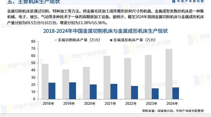 金属切削机床是通过切削、特种加工等方法,将金属毛坯加工成所需形状和尺寸的机器。金属成型类数控机床是一种集机械、电子、液压、气动等多种技术于一体的高精度加工设备。据统计,截至2024年我国金属切削机床与金属成形机床产量分别为69.5万台与16万台,增速分别为13.38%与5.96%。
