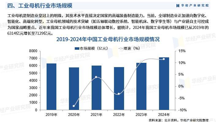 工业母机是制造业皇冠上的明珠,其技术水平直接决定国家的高端装备制造能力。当前,全球制造业正加速向数字化、智能化、高端化转型,工业母机领域的技术突破与产业链自主可控成为国家战略重点。近年来我国工业母机行业市场规模总体增长,据统计,2024年我国工业母机市场规模已从2019年的6314亿元增长至7129亿元。