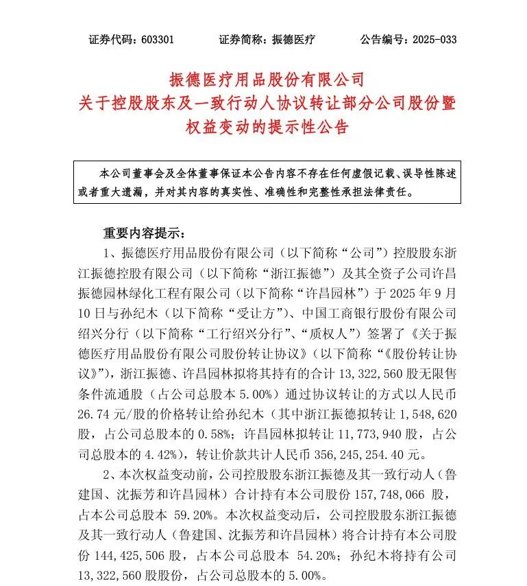 回溯近期企业大事件,振德医疗于上周发布一纸公告,抛出重磅交易:控股股东浙江振德控股有限公司及其全资子公司许昌振德园林绿化工程有限公司,拟将合计 1332 万股无限售流通股(占公司总股本 5%)以 26.74 元 / 股的价格转让给 “钢铁大亨” 孙纪木,转让总价款达 3.56 亿元。