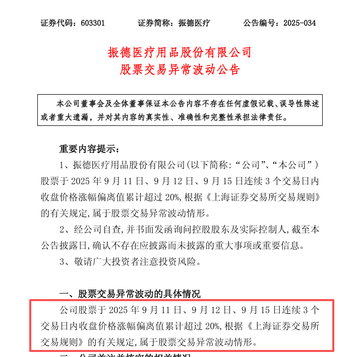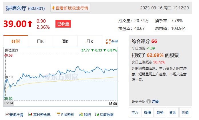 从二级市场反应来看,9 月 11 日,受孙纪木举牌消息刺激,振德医疗股价强势涨停,报 32.4 元 / 股,截至今日收盘(9月16日),报 39 元/股,对应最新市值 103.9 亿元。
