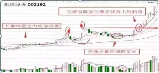 以个股融捷股份(002192)为例,前期长时间缩量盘整,主力在底部区域充分吸筹,后形成金蛤蟆形态。主力震仓洗筹股价回调,右爪芝麻点量的时候出现中期买点,可潜伏。随后股价连续收阳,突破金蛤蟆双眼高位时已奠定了强势的上涨态势,短线速战速决收益颇丰!