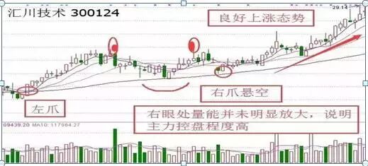 以上图汇川技术(300124)为例,5日线上穿10日线形成金叉,股价在60日均线处开始上涨,K线五连阳将股价不断推高,形成左眼,中途回档,庄家继续建仓收集筹码,触碰60日线后止跌回升。量能并未明显放大的前提下股价再次拉升到右眼位置,说明主力控盘程度高。右爪悬空说明后市走势强势,果不其然最终走出良好的上升形态。