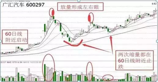 以广汇汽车为例,前期该股长期横盘,在60日附近股价开始启动,形成“金蛤蟆”形态左爪,两次放量上涨形成左眼和右眼。中途两次下跌都是量能皱缩,并且皆在接近60日线时止跌,不碰60日线。在整个形态完成以后,该股股价一路上行。