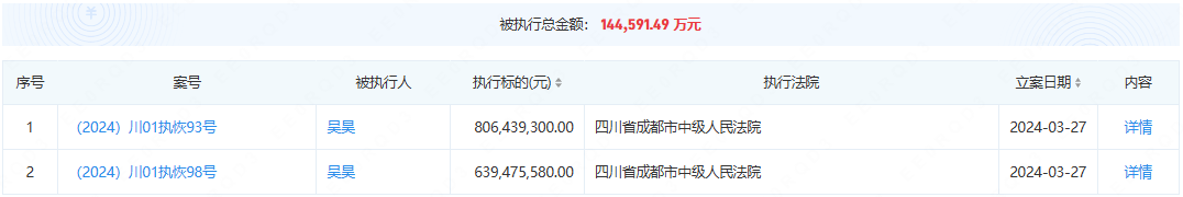 同年3月24日,四川省成都市中级人民法院公布的两则被执行人信息显示,吴昊被执行总金额已高达14.459亿元。