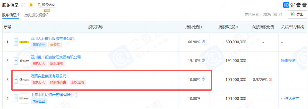 公司官网介绍,天府金租由四川天府银行发起,于2016年12月12日正式开业,注册地位于四川省成都市,是四川首家金融租赁公司。企查查信息显示,四川天府银行持股比例为60.9%,万腾实业持股10%。