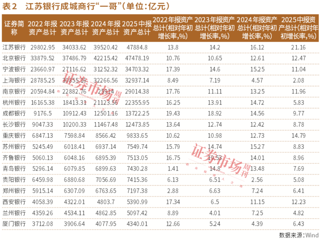 江苏银行的资产规模增长让其在城商行排名中发生了质的飞跃。凭借这一高速增长,2025年年中江苏银行超过北京银行,坐上了城商行“一哥”的位置(见表2)。