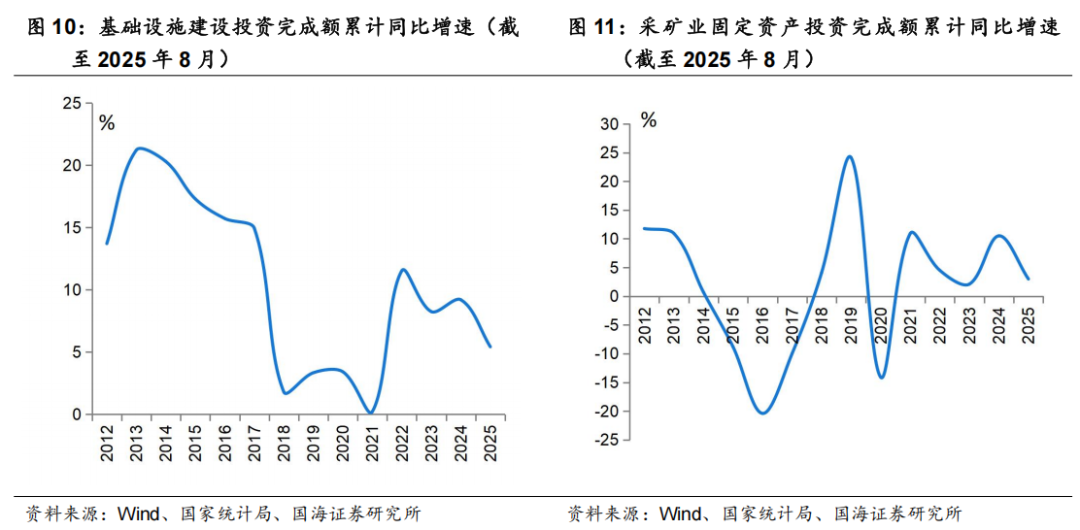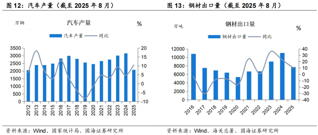 从下游来看,1-8月相较1-7月,钢材出口同比增速下降,基建、制造业投资略有放缓,地产依然低迷。2025年1-8月基建投资完成额同比+5.42 %,增速较1-7月下降1.87 pct,房地产开发投资完成额1-8月同比-12.90%,降幅较1-7月扩大0.90pct,房屋新开工面积1-8月同比-19.50%,降幅较1-7月扩大0.10 pct。此外,2025年1-8月,制造业投资同比+5.10 %,增速较1-7月放缓1.10 pct,钢材出口1-8月同比+10.00 %,增速较1-7月下降1.40pct。