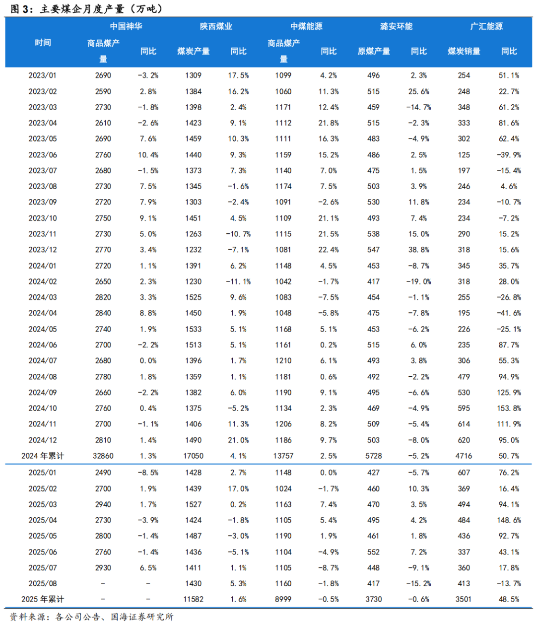 生产方面:8月原煤生产同比-3.20%,降幅较7月收窄0.60pct。2025年8月,规上工业原煤产量3.9亿吨,同比减少3.20 %,降幅相较7月收窄0.60pct,应主要系迎峰度夏期间,旺季用煤支撑所致。2025年8月,规上工业原煤日均产量为1,260万吨,月度环比增加30.7万吨/天,同比减少19.5 万吨/天。1-8月,规上工业原煤产量31.65亿吨,累计同比增长2.80%,累计同比增速相较1-7月降低1.00 pct。样本大型煤企8月煤炭生产分化。我们以中国神华、陕西煤业、中煤能源、潞安环能、广汇能源为样本。2025年8月,陕西煤业煤炭产量为1430万吨,同比+5.3%;中煤能源煤炭产量为1160万吨,同比-1.8%;潞安环能原煤产量为417万吨,同比-15.2%。整体看,样本公司煤炭产量同比分化。