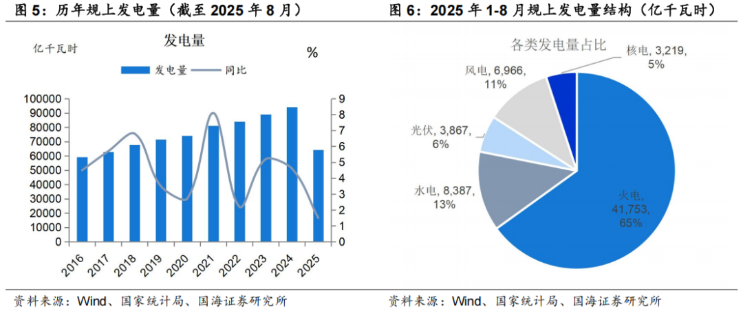 8月规上工业火电同比+1.7%,同比增速较7月放缓2.6pct。规上工业电力生产平稳增长。8月份,规上工业发电量9363亿千瓦时,同比增长1.6%;日均发电首次突破300亿千瓦时,达302.0亿千瓦时。1—8月份,规上工业发电量64193亿千瓦时,同比增长1.5%,扣除天数原因,日均发电量同比增长1.9%。分品种看,8月份,规上工业风电增速加快,水电降幅扩大,火电、核电、太阳能发电增速放缓。其中,规上工业火电同比增长1.7%,增速比7月份放缓2.6个百分点;规上工业水电下降10.1%,降幅比7月份扩大0.3个百分点;规上工业核电增长5.9%,增速比7月份放缓2.4个百分点;规上工业风电增长20.2%,增速比7月份加快14.7个百分点;规上工业太阳能发电增长15.9%,增速比7月份放缓12.8个百分点。1-8月,规上工业火电累计同比下降0.80 %,降幅比1-7月收窄0.50 个百分点;规上工业水电累计同比下降5.50 %,降幅比1-7月扩大1.00个百分点;规上工业核电累计同比增长10.10 %,增速比1-7月放缓0.70 个百分点;规上工业风电累计同比增长11.60 %,增速比1-7月加快1.20 个百分点;规上工业太阳能发电累计同比增长23.40 %,增速比1-7月加快0.70 个百分点。